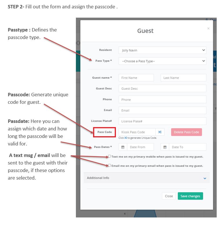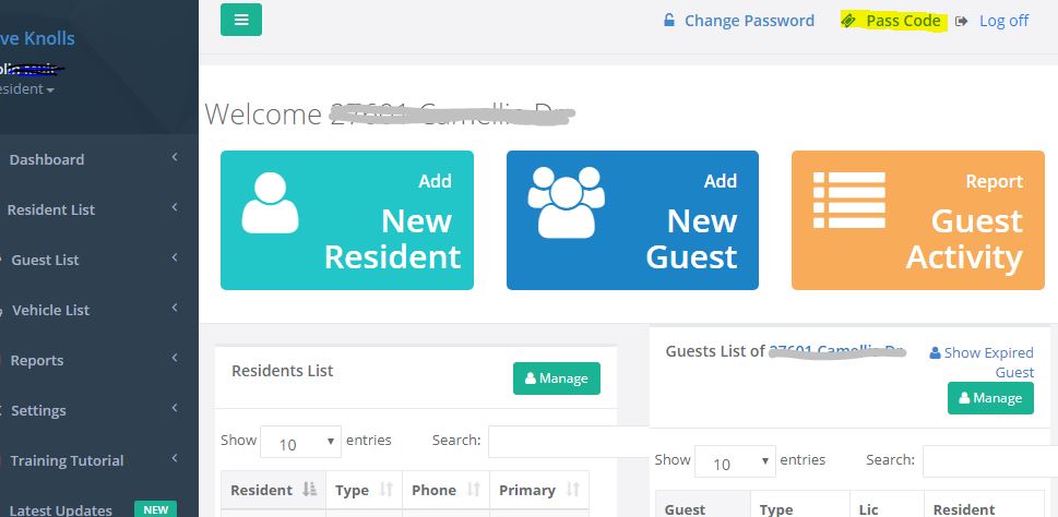 Login to your resident portal using your login credential and you can find your passcode option located on the top right corner of your page.